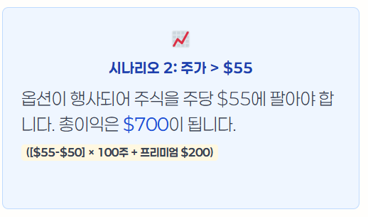 • 주가가 행사가 이상으로 상승: 옵션이 행사되어 주식을 그 가격에 팔아야 하지만, 이미 프리미엄을 받았기 때문에 총 수익은 제한적이지만 안정적입니다.