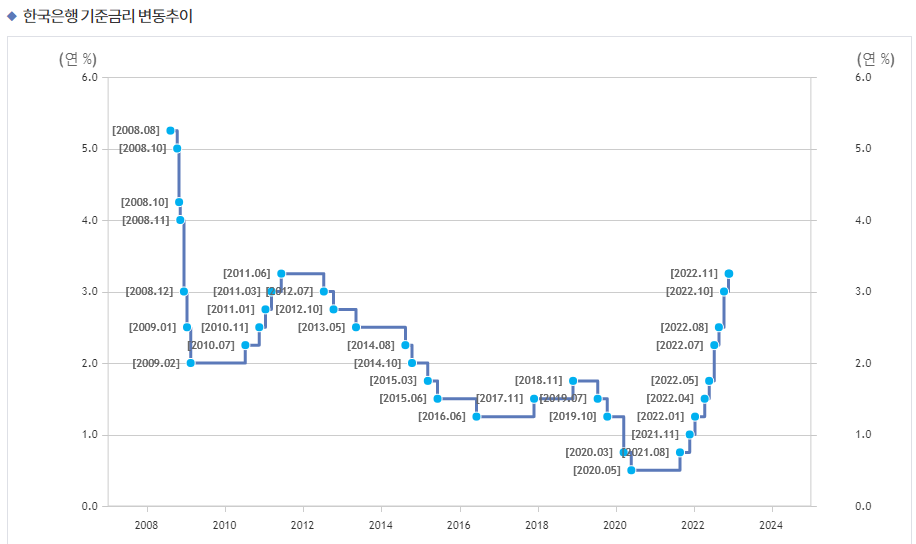 기준금리 인상은 2022년 1년 만에 아홉차례나 이어지고 있습니다. 2021년 8월 기준금리 0.5%가 2023년 말 3.25%로 무려 2.75%포인트가 인상되었습니다.