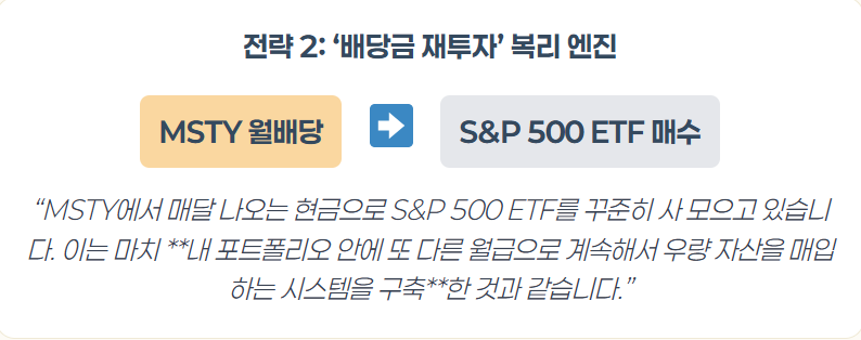 MSTY를 통해 창출된 강력한 현금흐름을 그대로 소비하는 대신, S&P 500과 같은 우량 자산에 재투자하는 방식입니다. 이를 통해 '현금흐름 자산(MSTY)'이 '성장 자산(S&P 500 ETF)'을 키우는 강력한 복리 엔진을 구축할 수 있습니다.