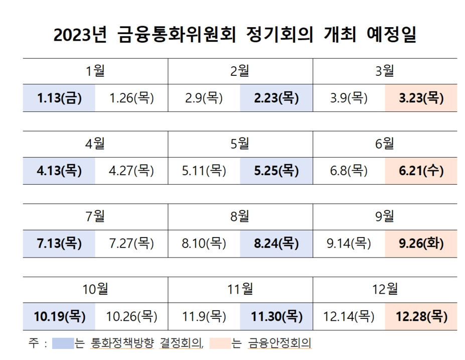 2023년 기준금리 발표 첫 회의는 내년 1월 13일(금요일)에 열리고 그 이후 2월 23일,4월 13일, 5월 25일, 7월 13일, 8월 24일, 10월 19일, 11월 30일 이렇게 총 8번이 예정되어 있습니다.